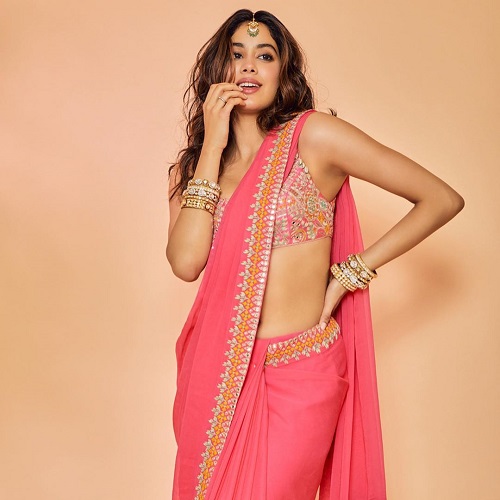The young starlet is slowly but surely stepping up her saree poses indoor game. Her young and vibrant style is perfect for young girls to try. For an effortless and cute look go for Janhvi’s pose of putting one finger to her lips and smiling away. A cute and fun saree photoshoot pose.