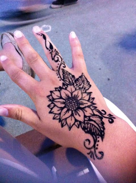 You should attempt this one-of-a-kind sunflower Mehendi design instead of the typical Mehendi patterns for kids. Draw the spiral stars and small dots that connect the sunflower motif on the back of your hand.