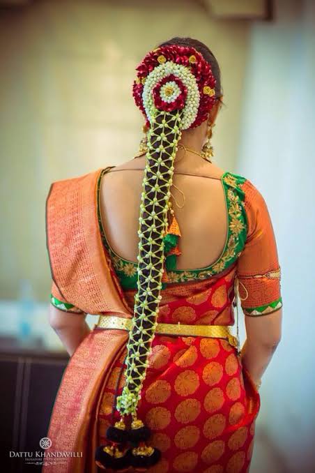 The Poola Jada is a hair item made of fresh flowers like jasmine and rose petals with a gold pendant nestled in between that it’s worn by the bride on her braid. Aside from the traditional motifs, modern brides have transformed this classic flower hair decoration into a modern netted variant.