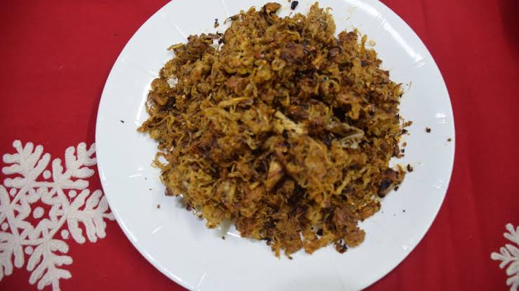 This is a non-vegetarian meal made with chicken and rice. In a single brass pot, cook spicy chicken. It’s made in a brass vessel since the natives feel that meals prepared in brass taste better. Fry the rice in a pan without any oil until it is light brown in color. The rice is then ground into powder using a combination. Place the cooked chicken on top of the powdered rice. It’s great as a snack or rice cake.